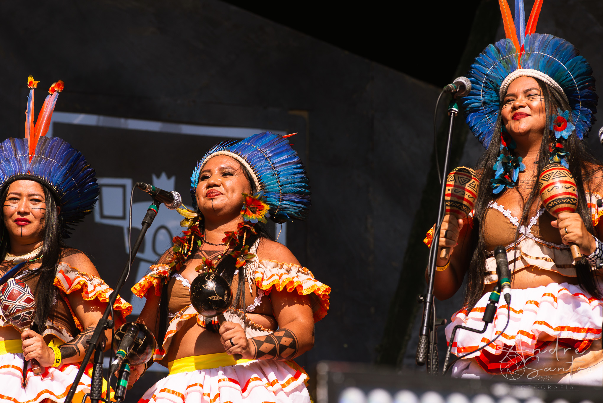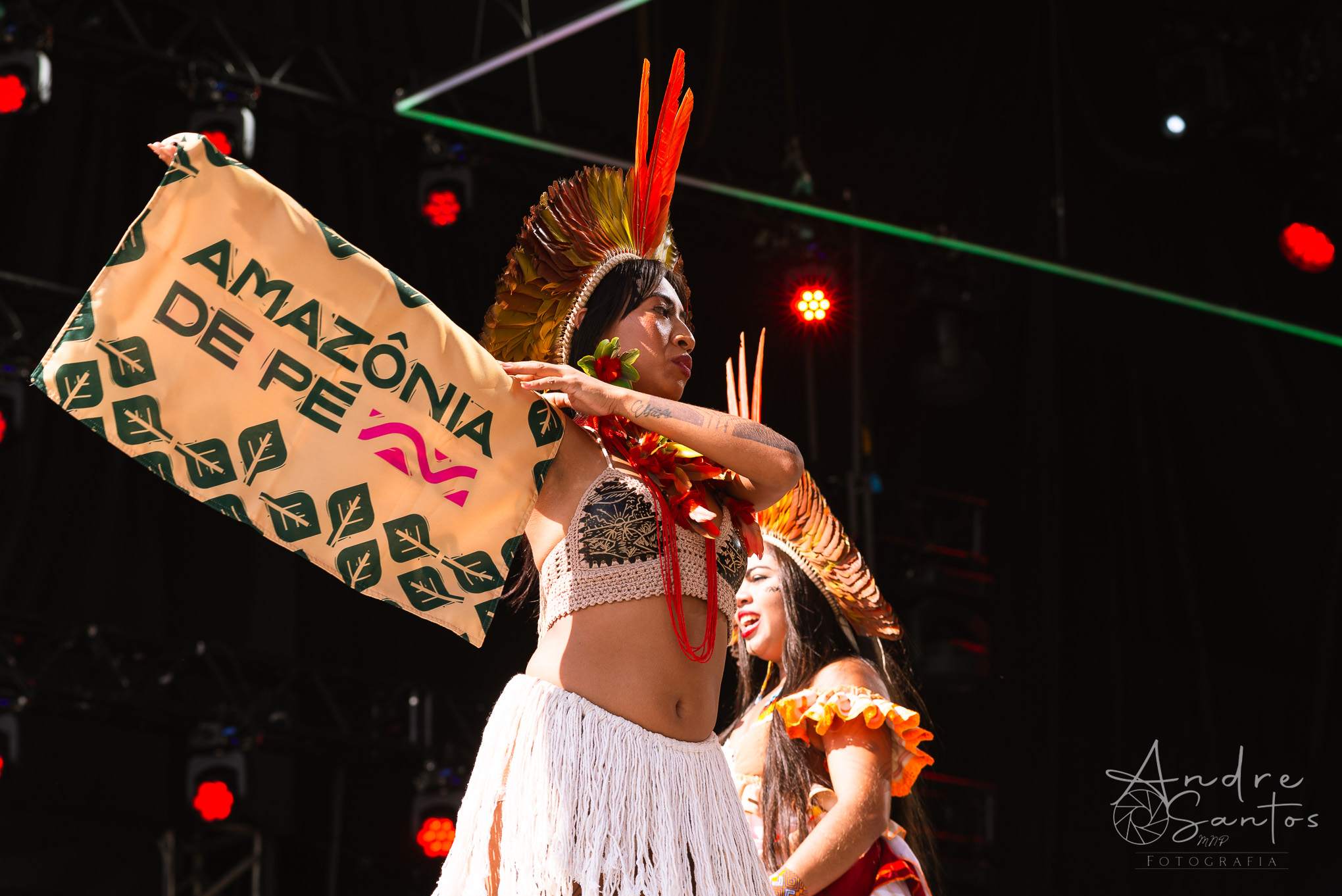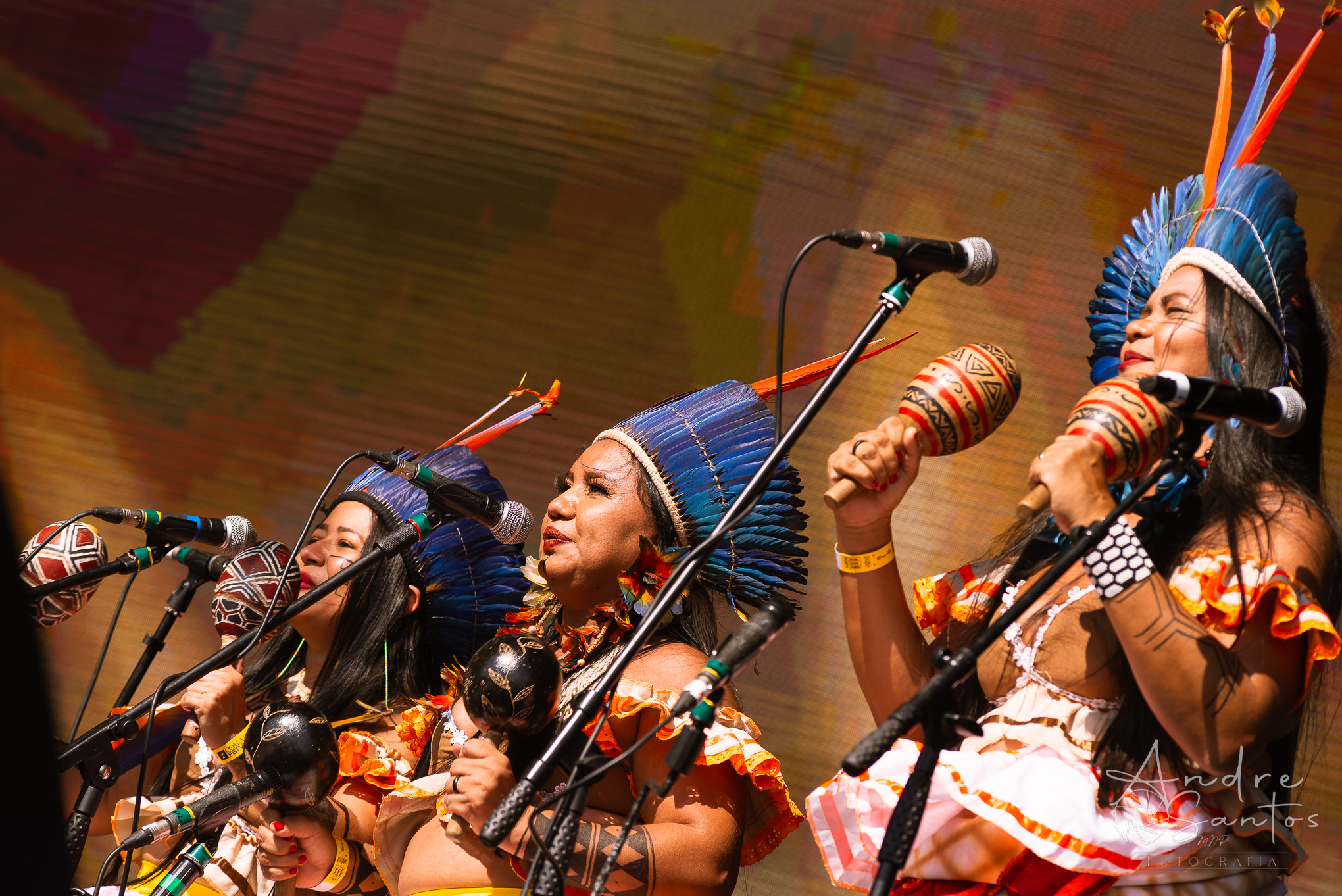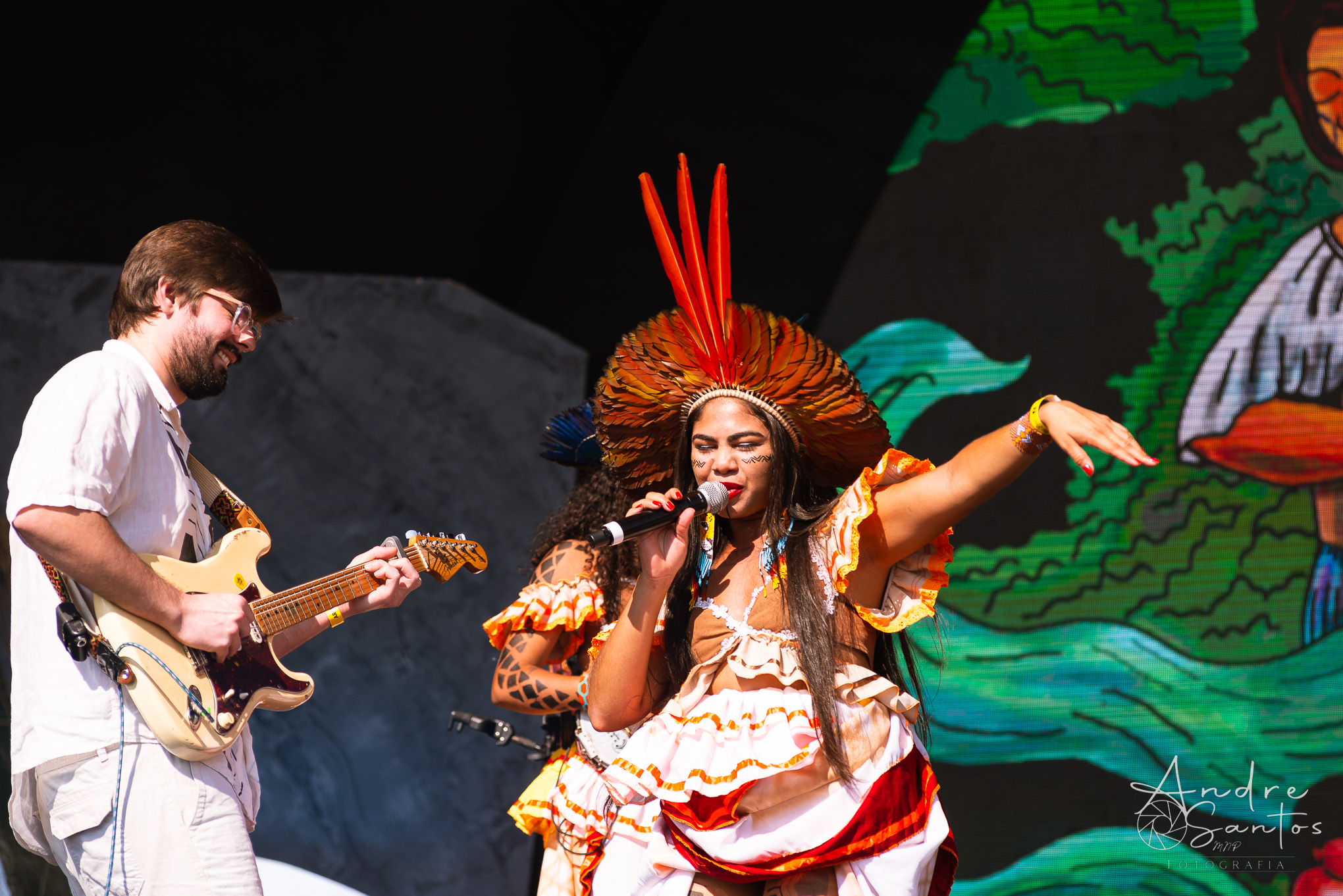 Em seguida, foi a vez da Suraras dos Tapajós, um grupo feminino do Pará que ergue a bandeira contra o machismo e exalta o empoderamento das mulheres indígenas. O show teve início com um protesto sob o tema “demarcação já”. À medida que a performance avançava, o público foi dominado pela envolvente percussão, movimentos de dança cativantes e os ritmos contagiantes do carimbó. Às vésperas do encerramento, Lucas Estrela, um dos guitarristas mais renomados do Norte do Brasil, fez uma breve participação especial, adicionando ainda mais brilho ao espetáculo. Foi um set muito criativo, marcado pela dança, pela beleza dos trajes tradicionais indígenas e por uma produção visual deslumbrante.