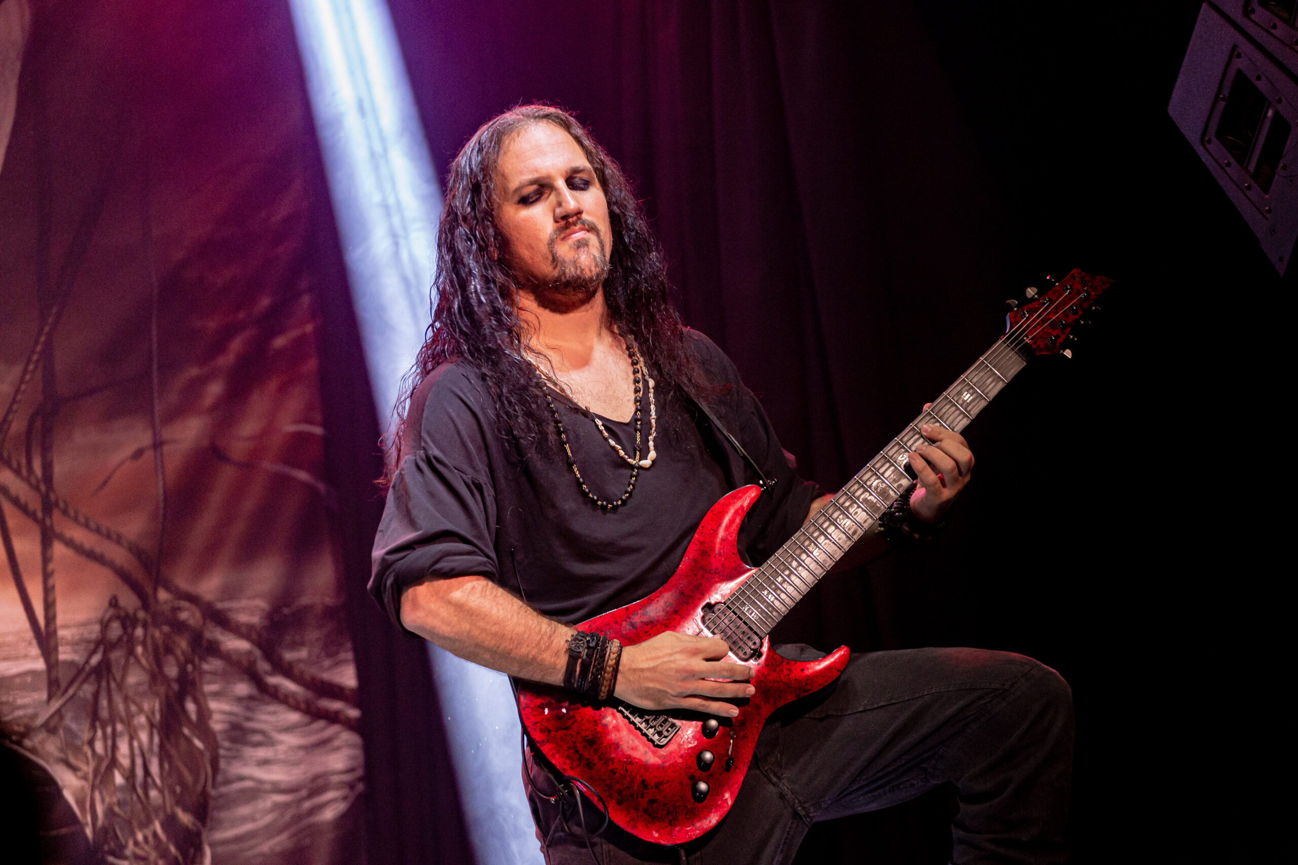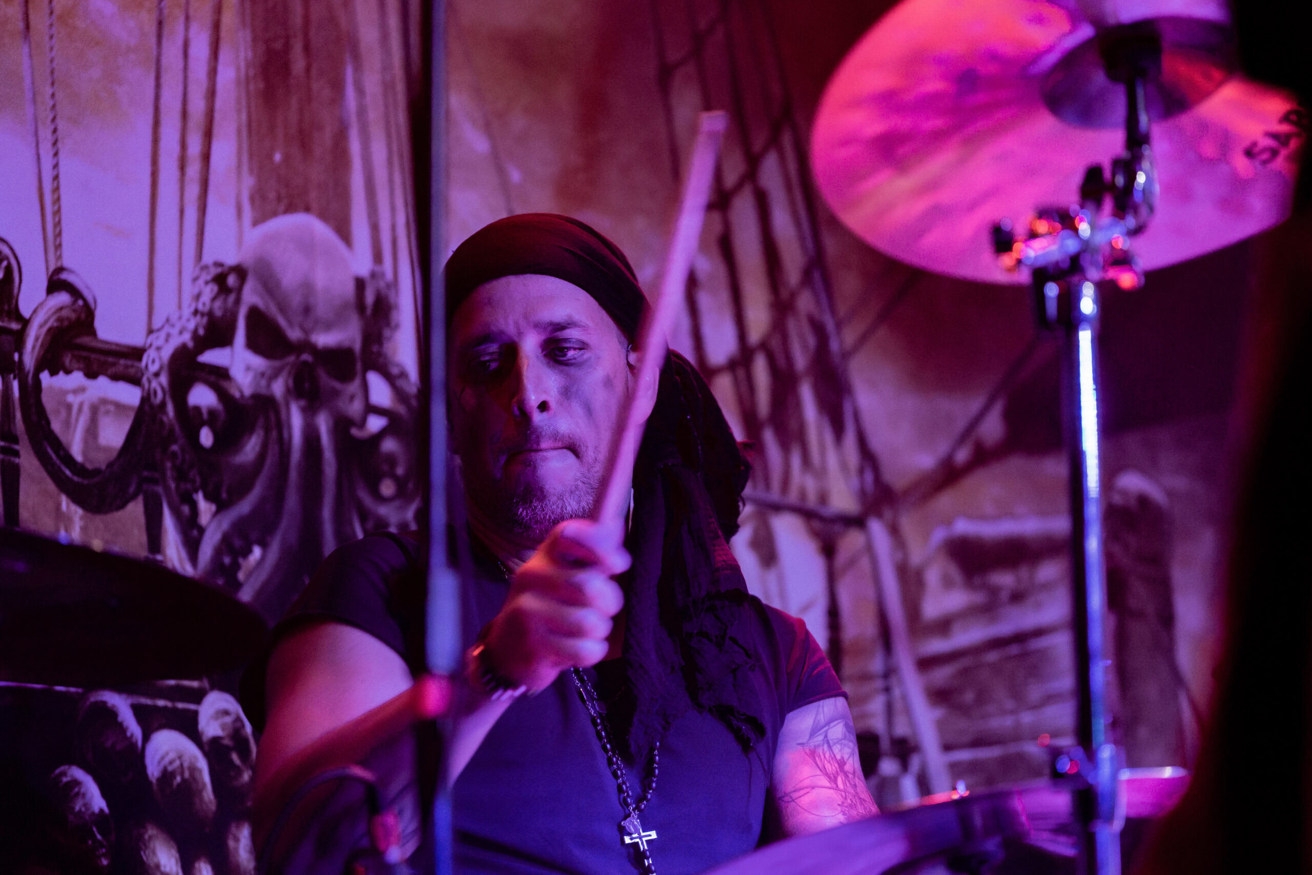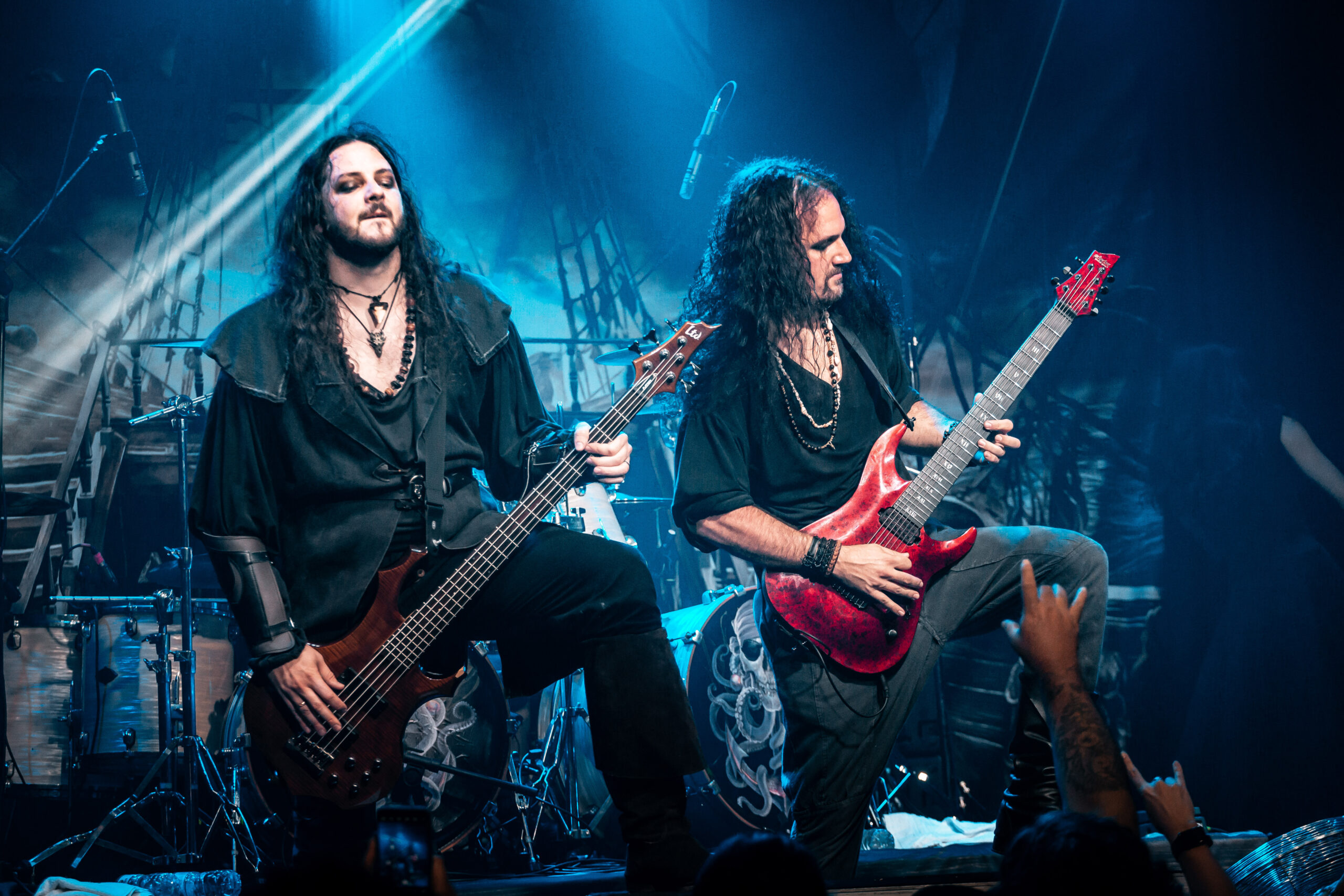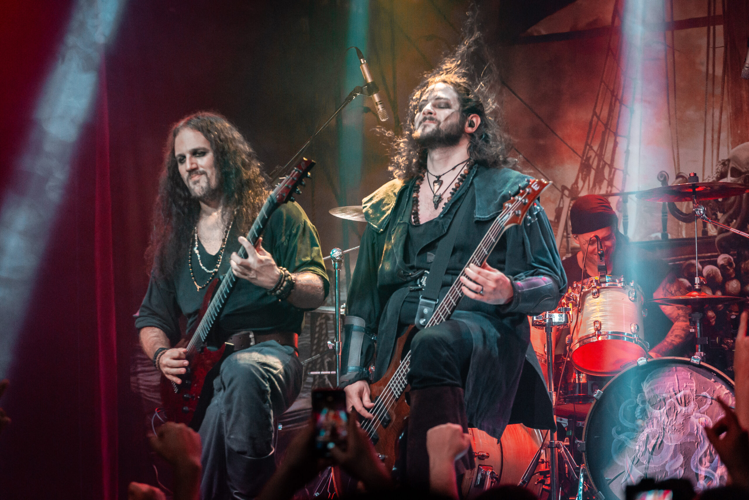 O show acaba focando mais no disco “Pirates” e eles tocam quase todas as canções dele, como “Mercy”, música que bebe diretamente do power metal e tem um refrão que lembra bastante dos cânticos piratas. Uma das canções mais características da banda e que traz o mesmo nome do álbum é “The Deep and The Dark” que foi a última turnê que eles trouxeram para o Brasil antes da pandemia. Mesmo os versos mais rápidos não impediram o público de cantar junto. O que era interessante ver durante o show é que celulares se erguiam para filmar partes da apresentação, mas não foi algo que aconteceu constantemente e os fãs aproveitaram bem o momento para curtir e interagir com a banda. Essa que entregou uma performance energética, esbanjando animação e carisma. O fato de ser um show menor não os barrou de entregar um show com qualidade e grandiosidade.