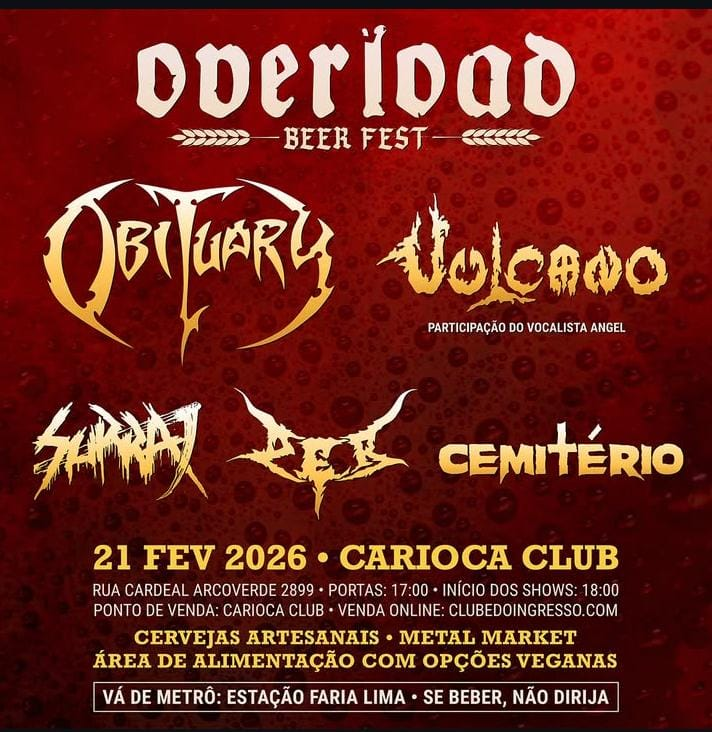 O aguardado encontro entre o Obituary, um dos maiores nomes do death metal mundial, e o Vulcano, pioneiro do metal extremo no Brasil, já tem nova data confirmada. O Overload Beer Fest, inicialmente previsto para 2025, foi remarcado para o dia 21 de fevereiro de 2026, um sábado, no Carioca Club, em São Paulo.