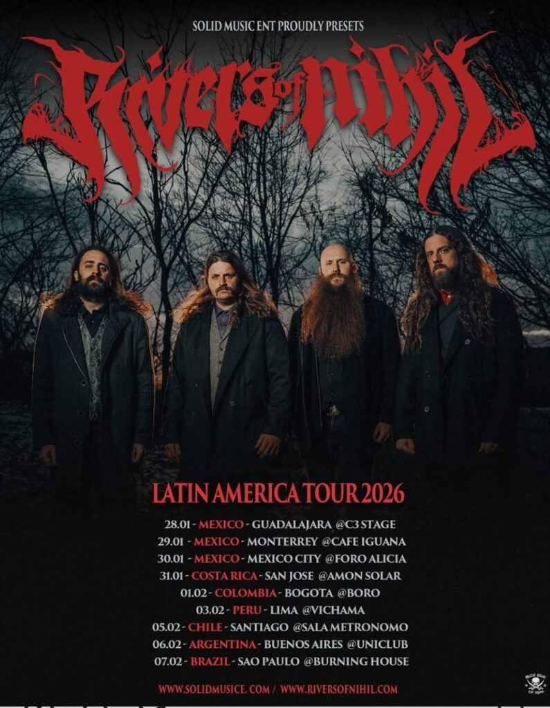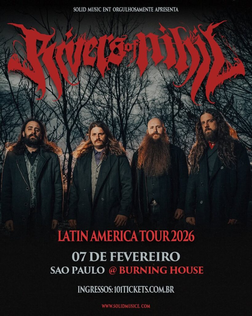 Aclamada como um dos nomes mais relevantes do death metal progressivo contemporâneo, a banda norte-americana Rivers of Nihil anunciou nesta semana uma extensa turnê pela América Latina em janeiro e fevereiro de 2026. O giro inclui nove apresentações, passando por Brasil, Argentina, Chile, Peru, Colômbia, Costa Rica e encerrando com uma sequência de três datas no México.