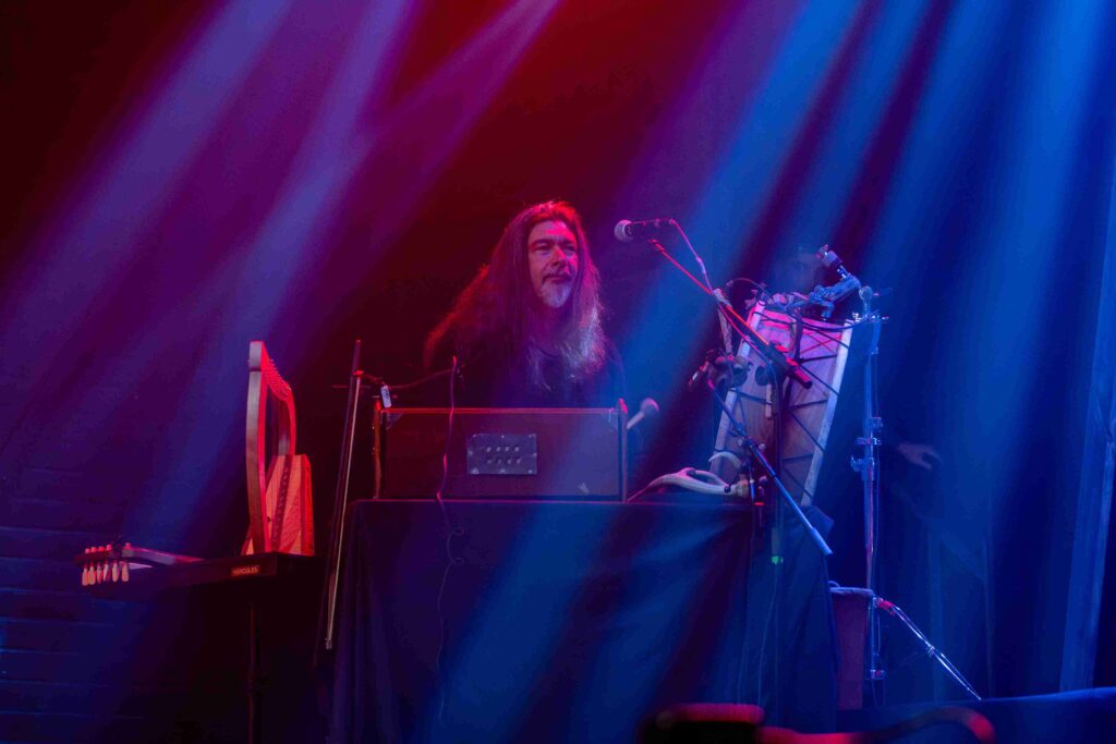 Com nova pontualidade, as cortinas do palco voltam a se abrir, e lá estava o Skáld! Embora em sua formação “normal”, nas gravações, a banda seja bem mais numerosa, os membros presentes na apresentação eram cinco, os principais, que aparecem em fotos e fazem as turnês — mas sempre deixam claro a importância dos músicos que gravam com eles. Se me perguntarem o nome dos instrumentos, terei que confessar que não passo nem perto de saber! Todos instrumentos típicos, folclóricos — de percussão e cordas. Boa parte dos sons ambiente e orquestrais, assim como corais, porém, eram em playback; compreensível, pois é um som extremamente cheio e detalhado.