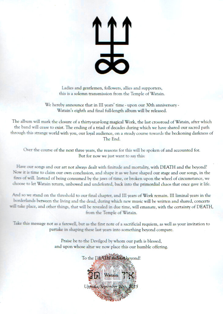 Anunciamos hoje que, dentro de três anos – marcando nosso 30º aniversário – Watain lançará seu oitavo e último álbum de estúdio.