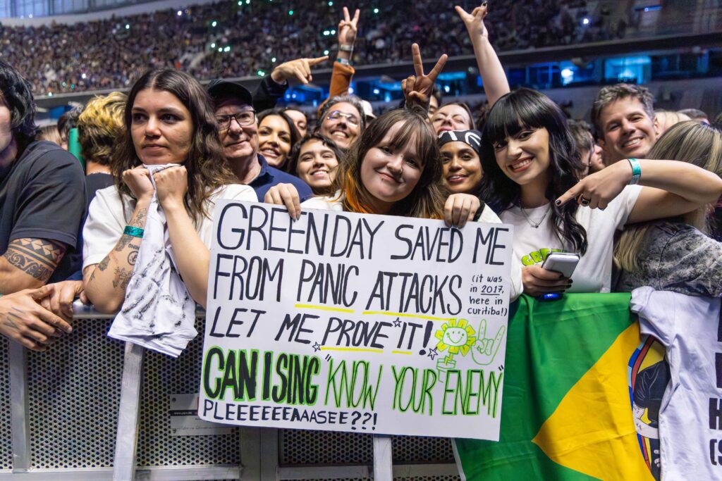 Quando chegou a vez de “Jesus of Suburbia”, a Arena foi tomada por uma energia quase épica. A longa e complexa faixa, dividida em vários atos, ganhou vida com cada mudança de ritmo e a banda conduziu a plateia por uma verdadeira montanha-russa de emoções. Fãs cantavam cada verso junto com Billie, enquanto a guitarra e a bateria criavam camadas de intensidade que tornavam impossível ficar parado. Foi um dos momentos mais grandiosos do show, mostrando não apenas a habilidade técnica do Green Day, mas também a conexão profunda que eles conseguem estabelecer com o público.