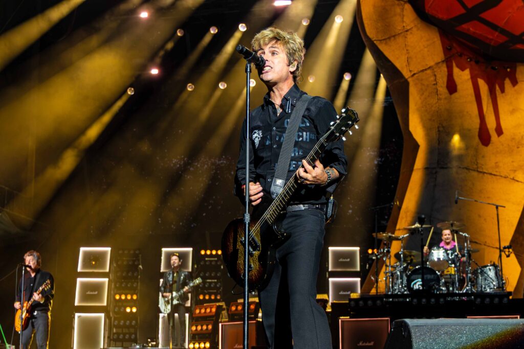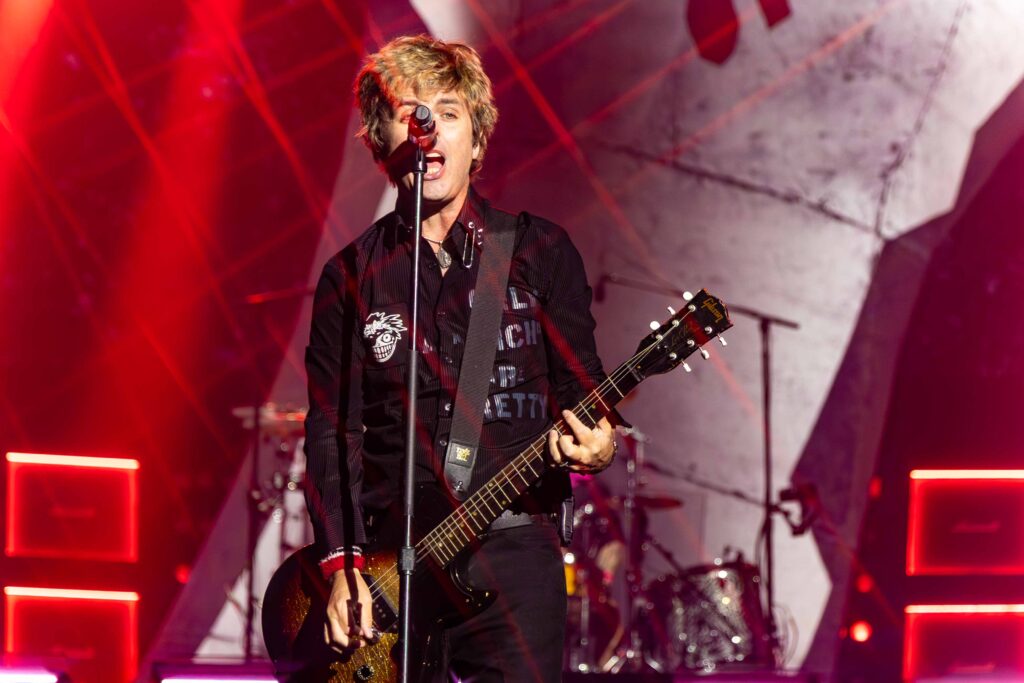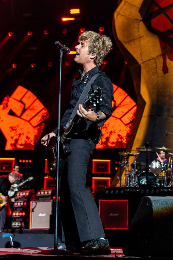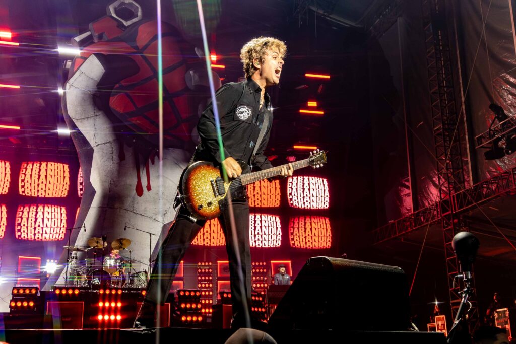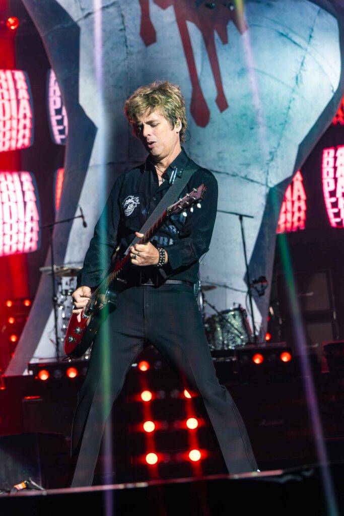 Em seguida, foi a vez de “Blitzkrieg Bop”, do Ramones, dar o tom da “segunda chamada”. Aos gritos de “hey ho, let ‘s go!”, fãs da pista e das arquibancadas se uniram em um coro poderoso. O clima já era de explosão quando Billie, Tré e Mike surgiram no palco e os primeiros acordes de “American Idiot” ecoaram. Ficou claro desde o início: o Green Day estava mais afiado do que nunca. E, antes mesmo de a música avançar, Billie cravou o pacto da noite com o público: “Quero ver todo mundo ficar louco, ok?”.