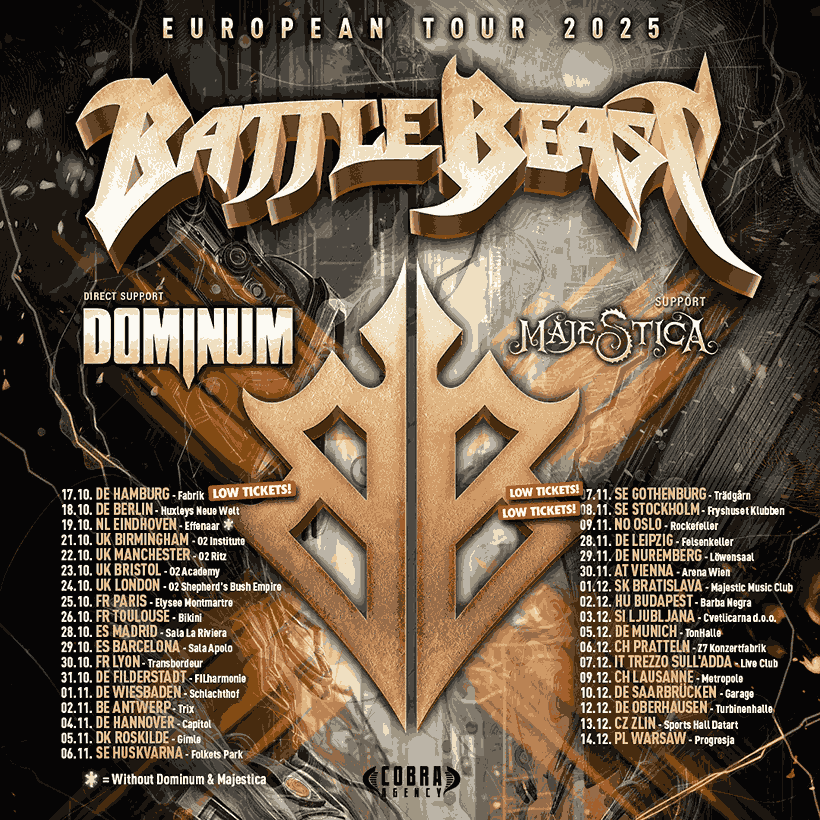 Para celebrar o lançamento do álbum, o BATTLE BEAST embarcará em uma grande turnê pela Europa, que começará hoje, dia 17 de outubro na Inselpark Arena, em Hamburgo — o maior show principal da banda na Alemanha até hoje. A turnê seguirá até meados de dezembro, com os DOMINUM como convidados especiais e a força do power metal sueco, MAJESTICA, como banda de abertura.
