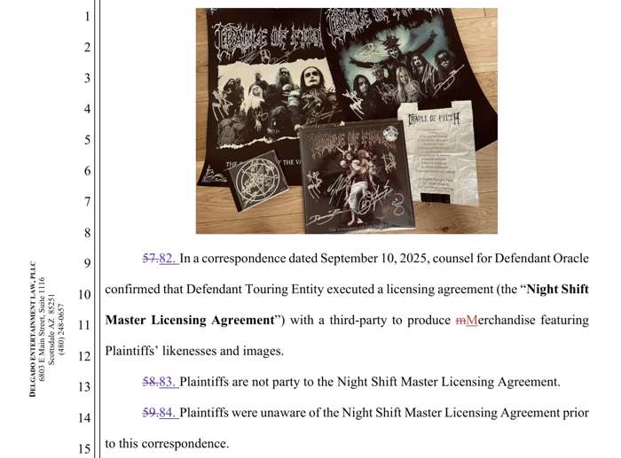 Seis ex-integrantes do Cradle of Filth ingressaram com uma ação conjunta contra a banda e sua equipe de gerenciamento no Tribunal Distrital dos Estados Unidos para o Distrito do Arizona. O grupo alega uso indevido de imagem e performances após suas saídas.