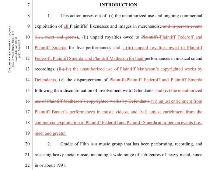 A ação é movida por Zoë Federoff, Marek “Ashok” Smerda, Lindsay Schoolcraft (Lindsay Matheson), Richard Shaw, Paul Allender e Sasha Baxter. Consta como réus Cradle of Filth LLP, Cradle of Filth Touring Ltd., o vocalista Daniel “Dani” Filth e a Oracle Management.