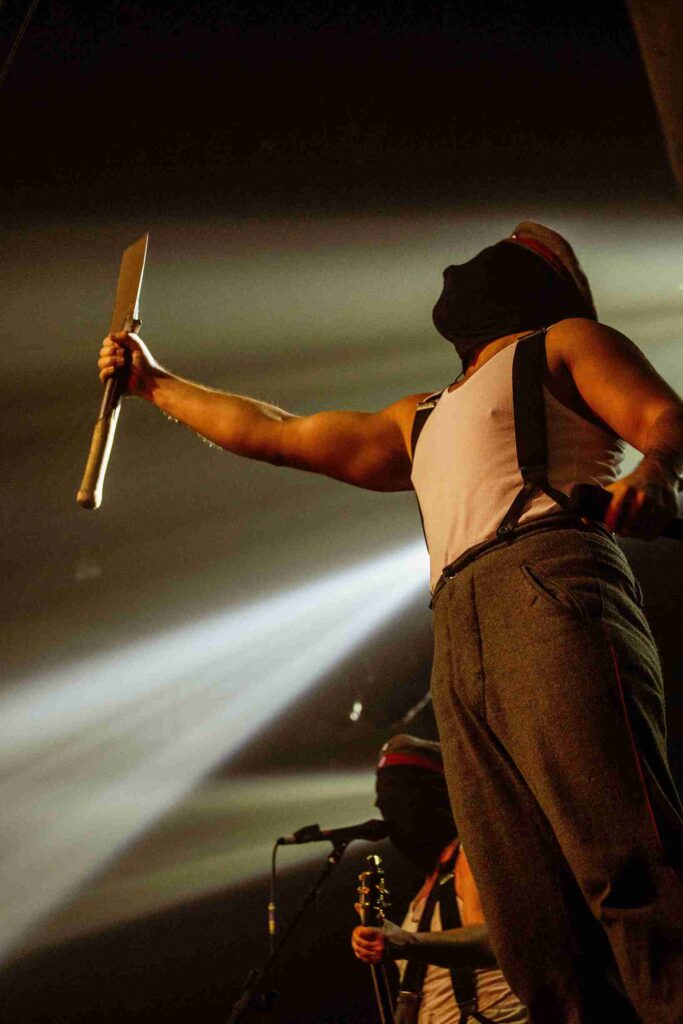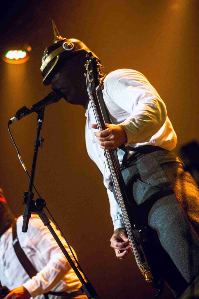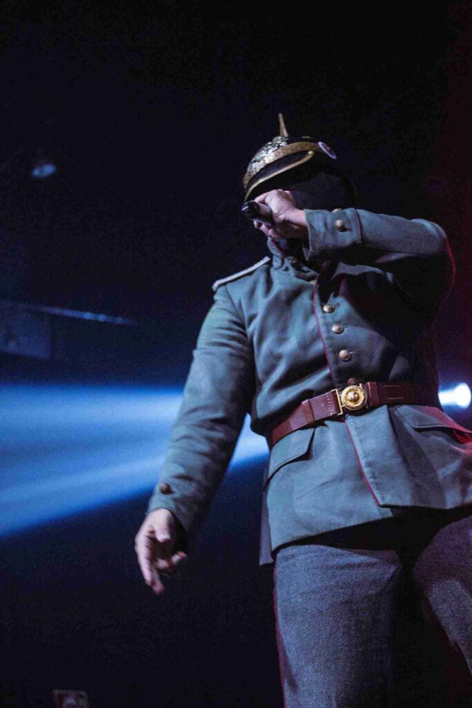 Confesso que, antes do show, tinha minhas dúvidas se seria algo realmente condizente com a proposta teatral da banda, ou se teríamos apenas mais um show com palco bonito, mas apresentação burocrática. Por sorte, essa dúvida logo foi embora. O vocalista Noise e seus comandados interpretam, sentem o que tocam — e é incrível isso em pessoas que estão com máscaras! Claro, tudo envolve dar a sensação de uma batalha na primeira guerra mundial: de tempos em tempos, o vocalista trocava de roupas, indo de um uniforme de soldado raso ao de comandante. Além de usarem aparatos que simulam armas, uma delas soltando fumaça de gelo seco no público. Um dos momentos mais interessantes foi a troca da própria máscara de Noise — tirou a totalmente preta, e colocou uma caveira no rosto! Em momento algum há palavras da banda para com o público, e não é antipatia, mas parte da performance.