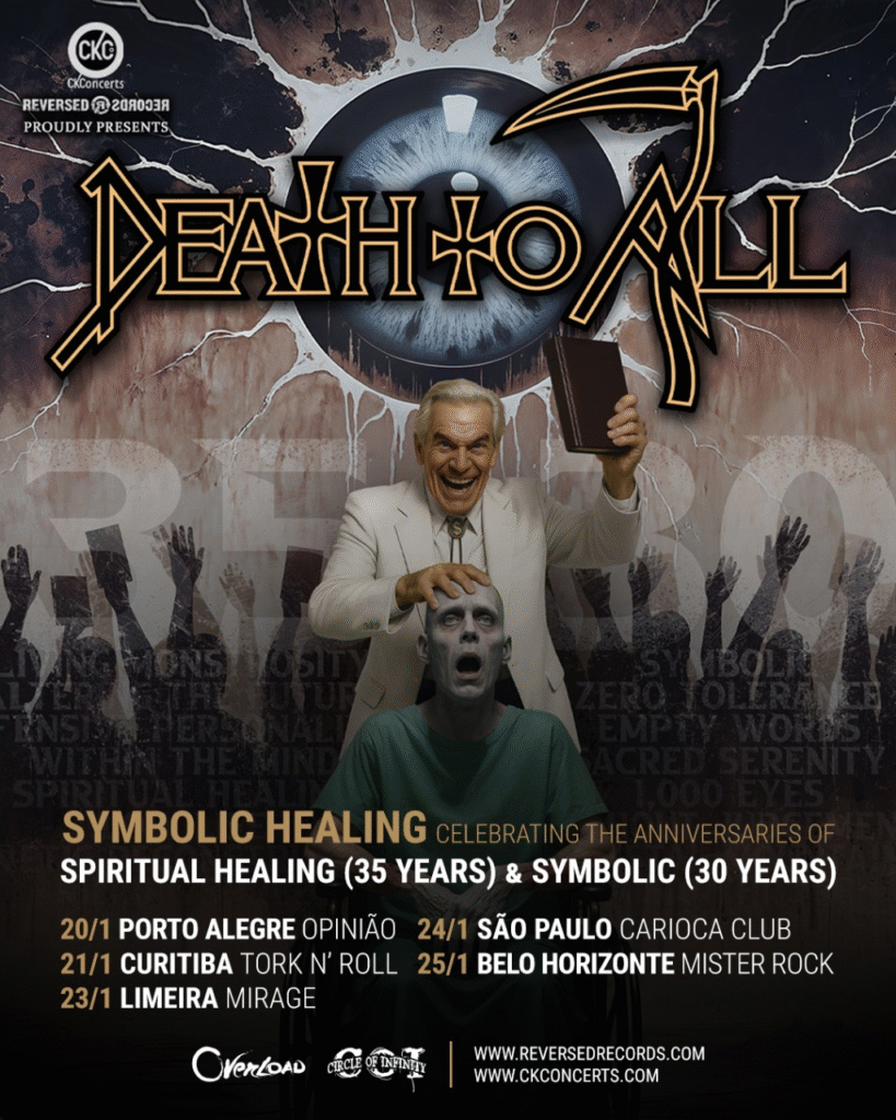 Death To All, projeto/turnê-tributo com ex-membros da banda norte-americana Death, está no Brasil para celebrar ao vivo os clássicos álbuns Spiritual Healing e Symbolic, que respectivamente completam 35 e 30 anos desde seus lançamentos na década de 1990. A turnê acontece de 20 a 25 de janeiro em cinco cidades.
