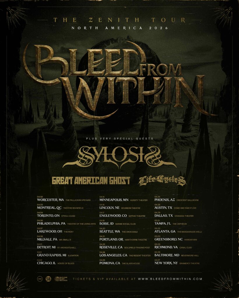 SYLOSIS também estará em turnê pela América do Norte durante abril e maio de 2026 com Bleed From WithinGreat American Ghost & Life Cycles. As datas completas estão aqui: