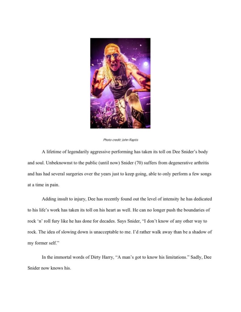 Em declaração separada, Snider afirmou que não considera a possibilidade de reduzir a intensidade de suas apresentações. “Não conheço outra forma de fazer rock. A ideia de desacelerar é inaceitável para mim. Prefiro me afastar a ser uma sombra do que já fui”, disse o vocalista.