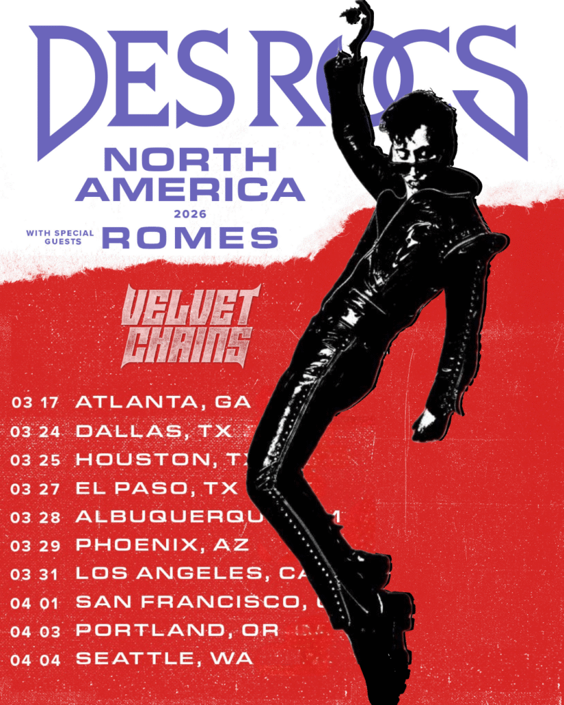Impulsionando o lançamento, o Velvet Chains se prepara para pegar a estrada como convidado especial da DES ROCS North America Tour 2026. Ao lado de Romes, a banda levará seu show explosivo para o público dos Estados Unidos. A série de 10 shows acompanhará o Des Rocs a partir de meados março e vai até o início de abril, com paradas em Atlanta, Dallas, Houston, Phoenix, Los Angeles, San Francisco, Portland, Seattle entre outras cidades.