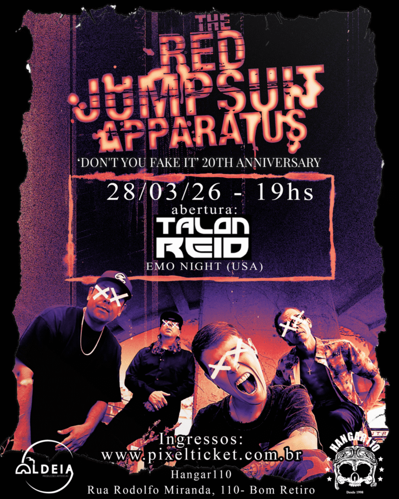 O show do The Red Jumpsuit Apparatus integra a turnê internacional que celebra os 20 anos de “Don’t You Fake It” (2006), álbum de estreia que se tornou um dos marcos da explosão do emo e do rock alternativo dos anos 2000 em rádios e programas de músicas na TV, ao lado de discos de nomes como My Chemical Romance, Taking Back Sunday e Fall Out Boy.
