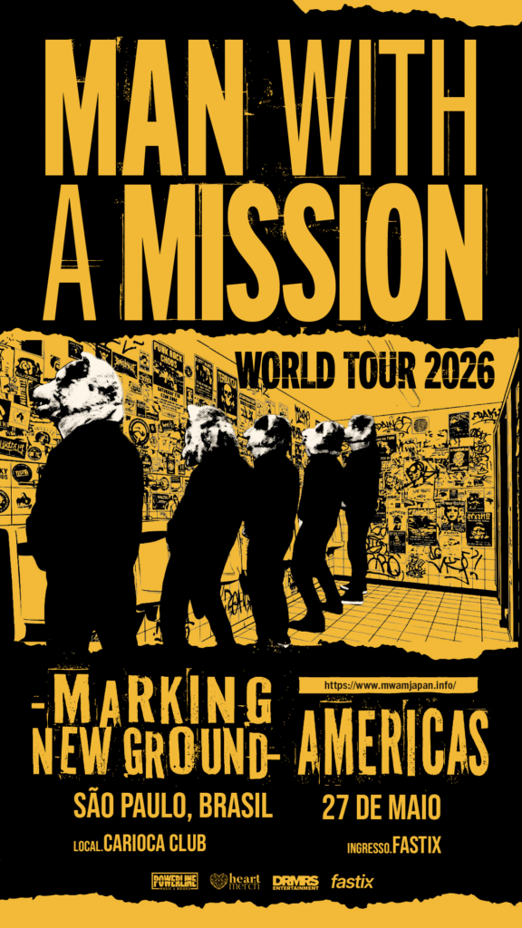 A consagrada banda japonesa MAN WITH A MISSION, com seu rock eletrônico que faz shows com cabeças gigantes de lobos, vem ao Brasil pela primeira vez para uma apresentação única no dia 27 de maio, no Carioca Club, em São Paulo/SP. O show é uma realização da Powerline Music & Books e Heart Merch.