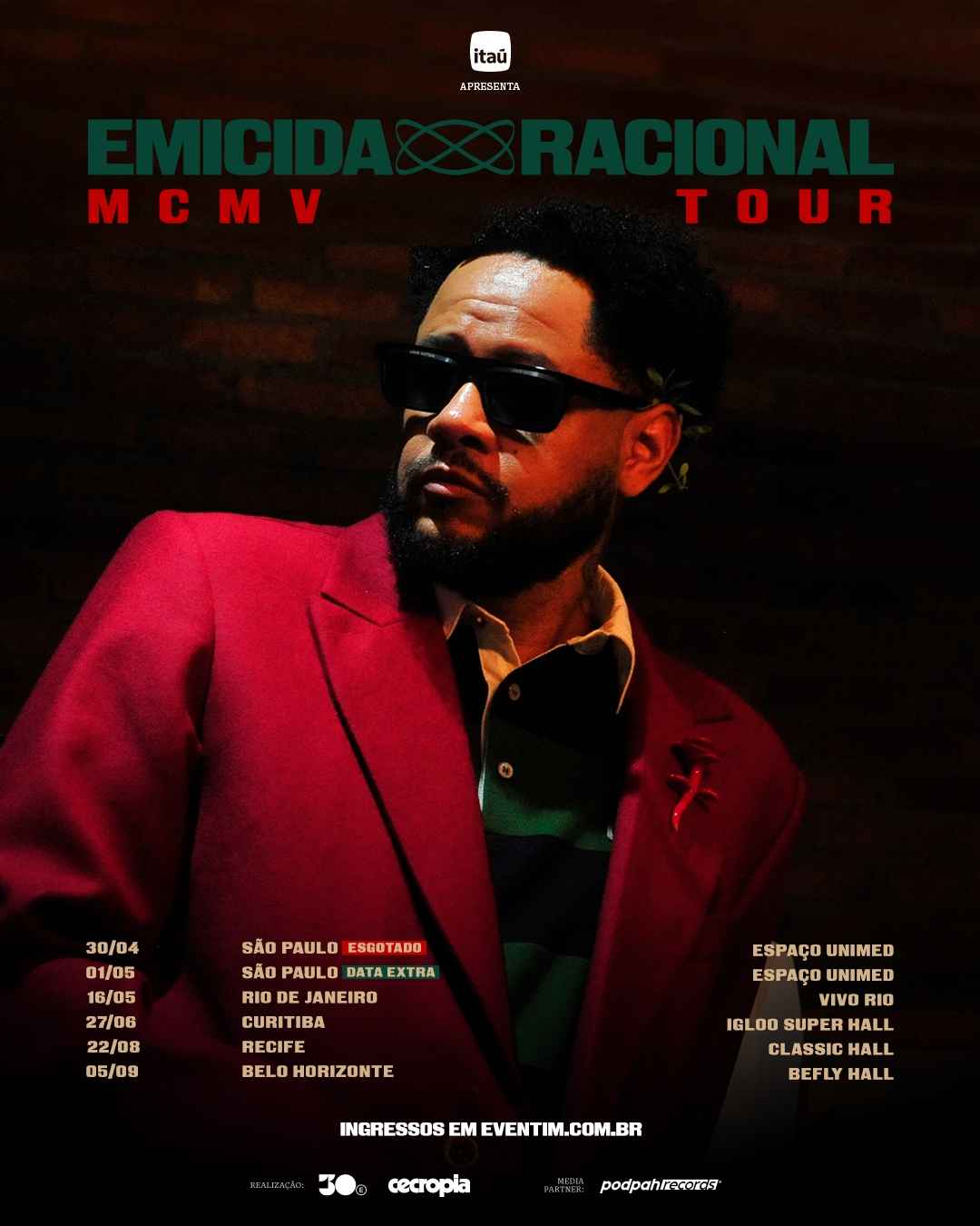 “A música é um território onde o Itaú constrói presença de forma consistente, indo além do patrocínio para criar experiências reais para o público. Ao anunciar essa turnê do Emicida, reunimos acesso, conveniência e benefícios que tornam a jornada dos fãs mais simples e mais próxima do espetáculo. Esse é o nosso papel na música, atuar como facilitador de encontros ao transformar grandes shows em experiências completas e em relacionamentos duradouros com as pessoas”, afirma Rodrigo Montesano, superintendente de Experiências e Conexões de Marcas do Itaú.