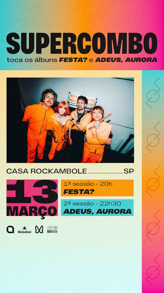 Já nos ajustes finais para o lançamento da parte 2 do álbum Caranguejo, a Supercombo se desliga por um breve instante deste processo e, nesta sexta-feira (13), faz dois shows especiais em um único dia: na Casa Rockambole, em São Paulo, o quarteto fará a primeira sessão, às 20h, tocando o disco Festa? e, às 22h30, volta ao palco para tocar Adeus, Aurora.