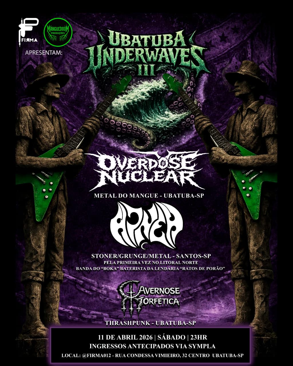 A apresentação de sábado ocorre em um evento promovido pela Firma e Manguedoom Produções. Em sua terceira edição, o Ubatuba Underwaves marca a primeira apresentação da Apnea (@apneaband) (Santos/SP) na região. O grupo, focado nas vertentes Stoner, Grunge e Metal, é formado por nomes emblemáticos da cena independente nacional, incluindo Boka (@bokardp), baterista do Ratos de Porão. O line-up do evento é completado pela banda local Cavernose Morfética (@cavernosemorfetica), voltada ao Thrashcore.