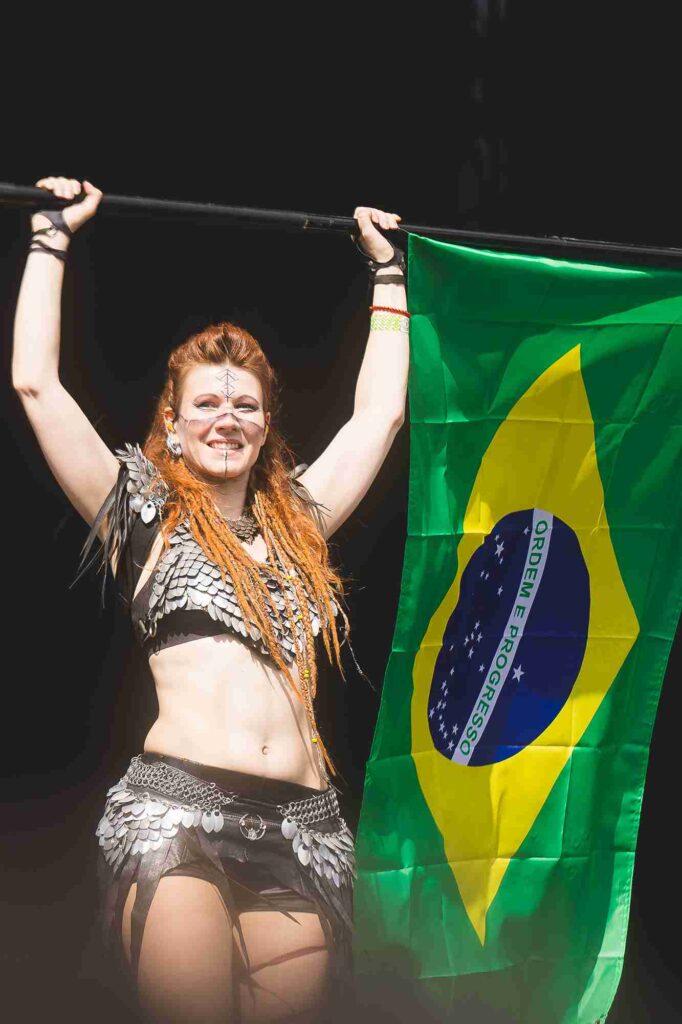 Com as performers Mieze Myu e Mieze Musch-Musch invadindo o palco sob bandeiras brasileiras erguidas com orgulho, o público que enfrentava o sol intenso das 14h10 foi rapidamente conquistado pelo carisma contagiante dos integrantes que surgiam em cena.